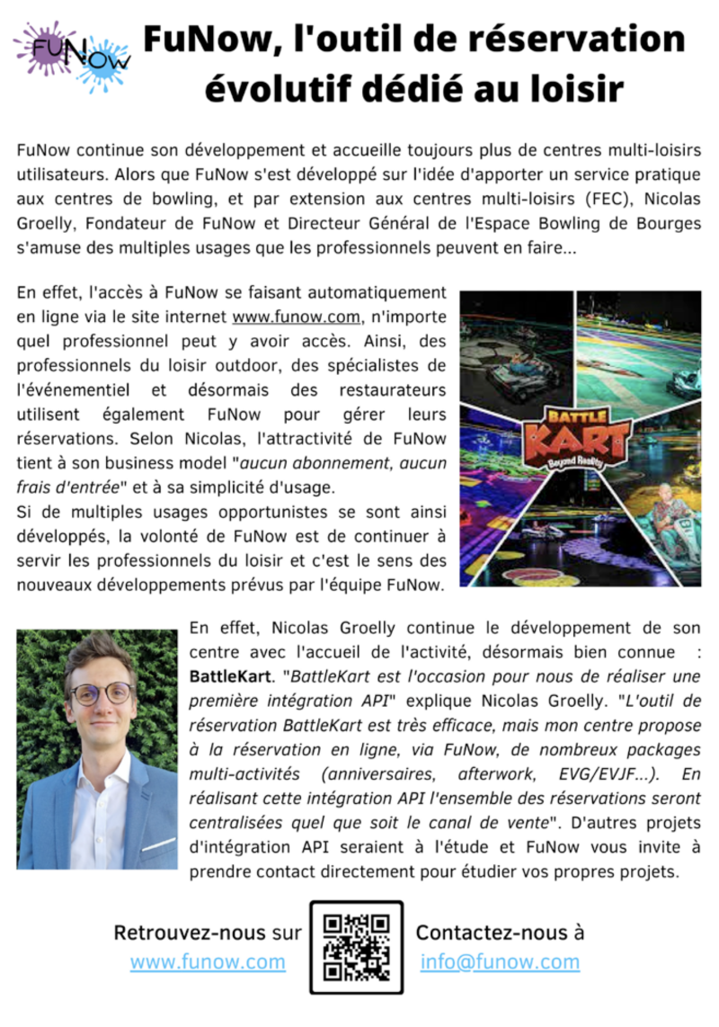 ! Profitant de son expérience en matière de connaissance des problématiques et de la gestion d'un centre de bowling Nicolas Groelly a créé la solution Funow en 2021. une plateforme de réservation à l'attention des professionnels du loisir.
